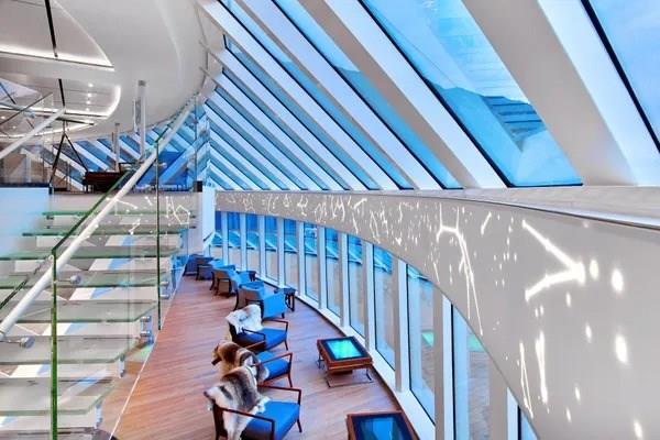 With two-story panoramic windows for maximum views, the Explorers’ Lounge is inspired by epic journeys of discovery. This inviting space is the perfect place to share a cocktail with friends or relax while taking in the scenery.